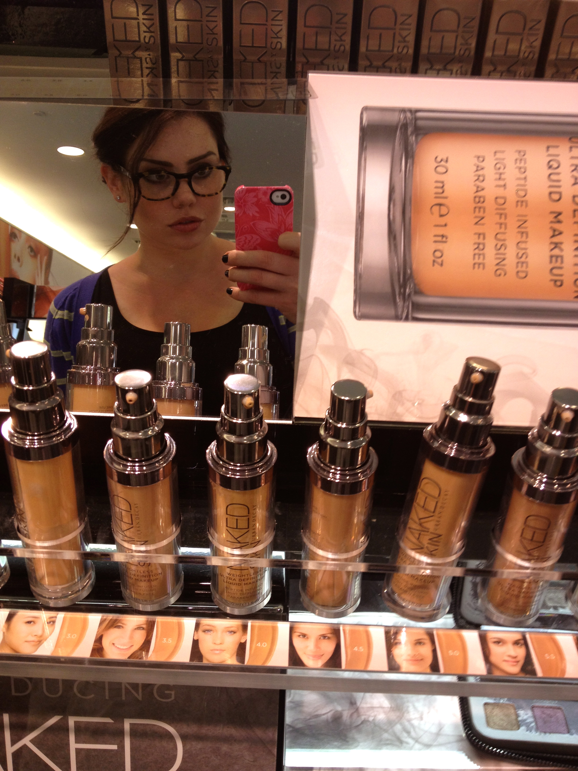 It was the new Urban Decay Naked Skin Weightless Ultra Definition Liquid Makeup ($38). I looked at it. It looked back. I pulled out my phone and took a picture of it (the fact that my face happened to be in the frame is purely coincidental, I assure you). I asked the salesperson nearest me (who was politely pretending not to notice my camera-whoring) if I could have a sample, and she made me one (bless you, Sephora).