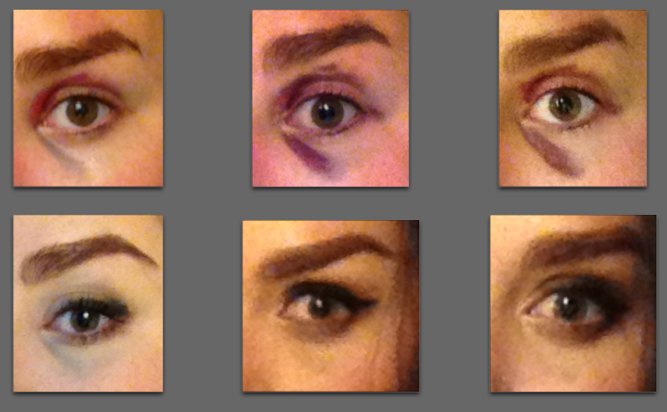 Bottom: Same days, corrected. I got better at concealing it the more I practiced even though the problematic areas migrated, and near the end of the whole thing I just looked kinda tired.